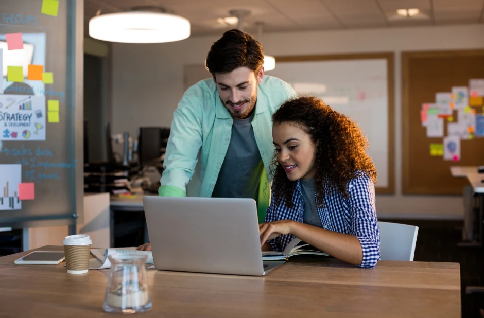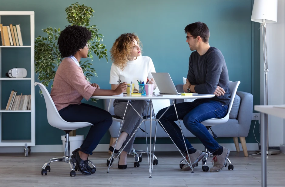 Colleagues discussing in coworking office